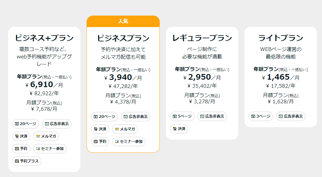 有償のプランでもページ数の制限があります。ライトプランで3ページ、レギュラープランで5ページ、ビジネスプランでも20ページとなります。
